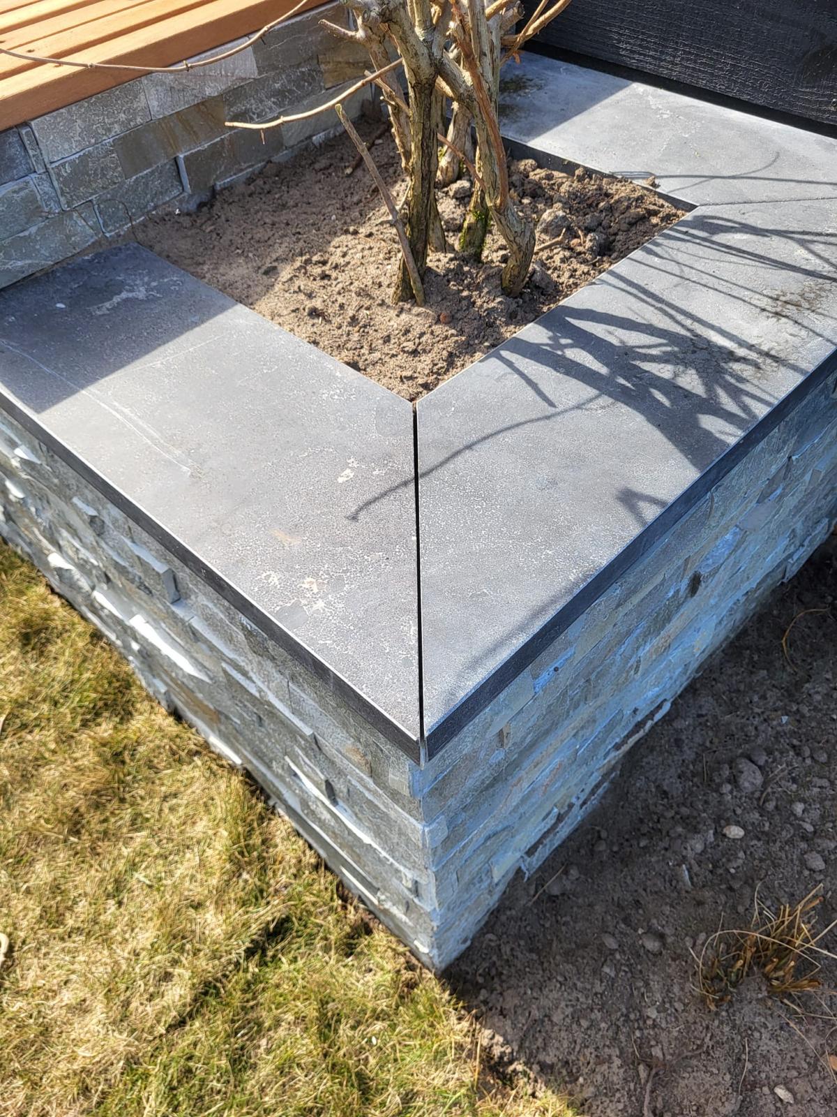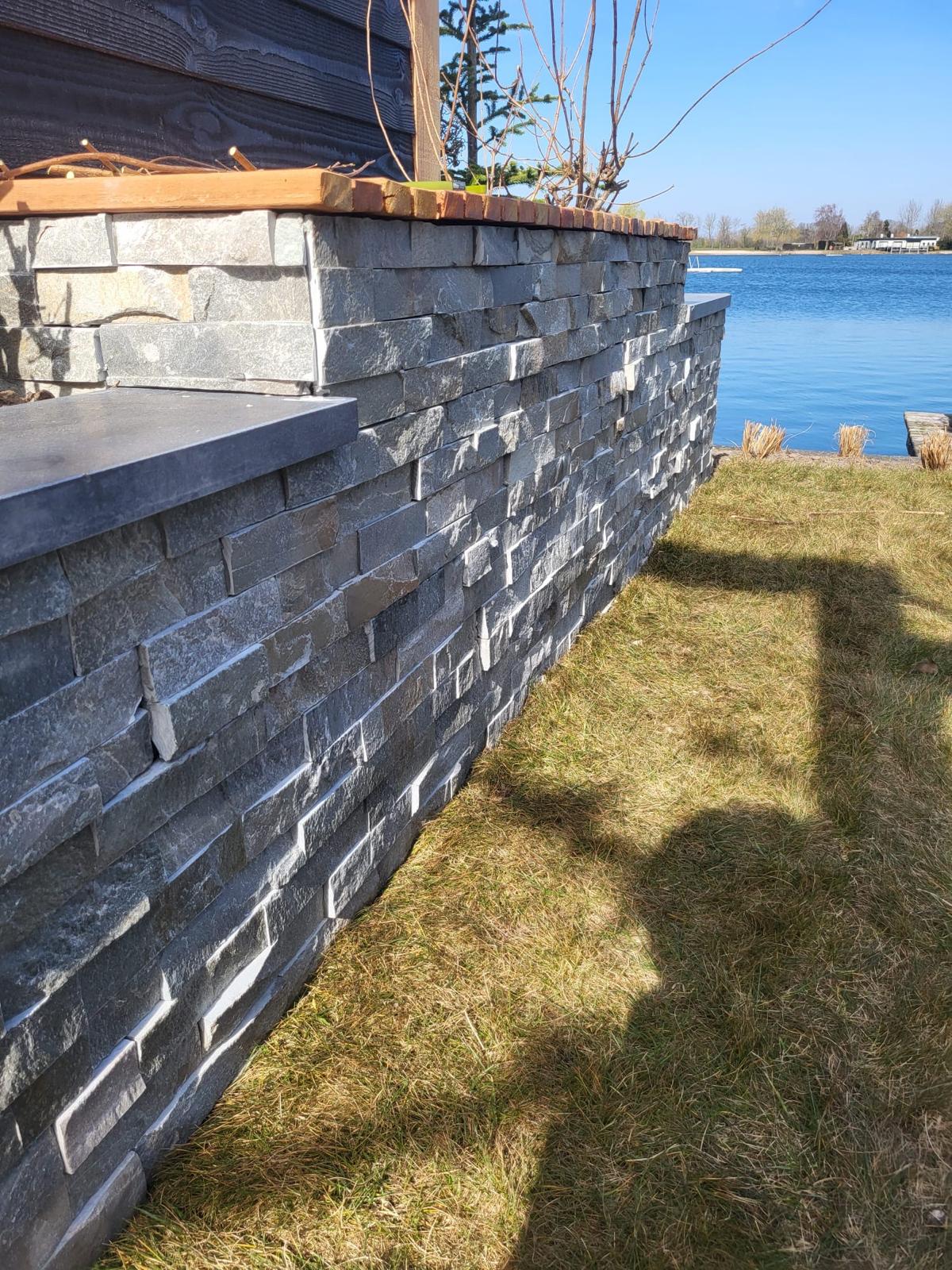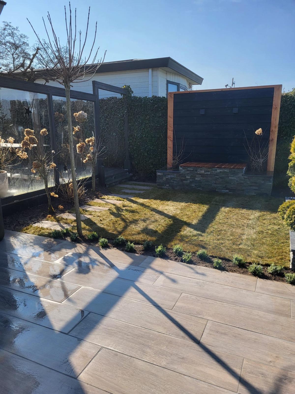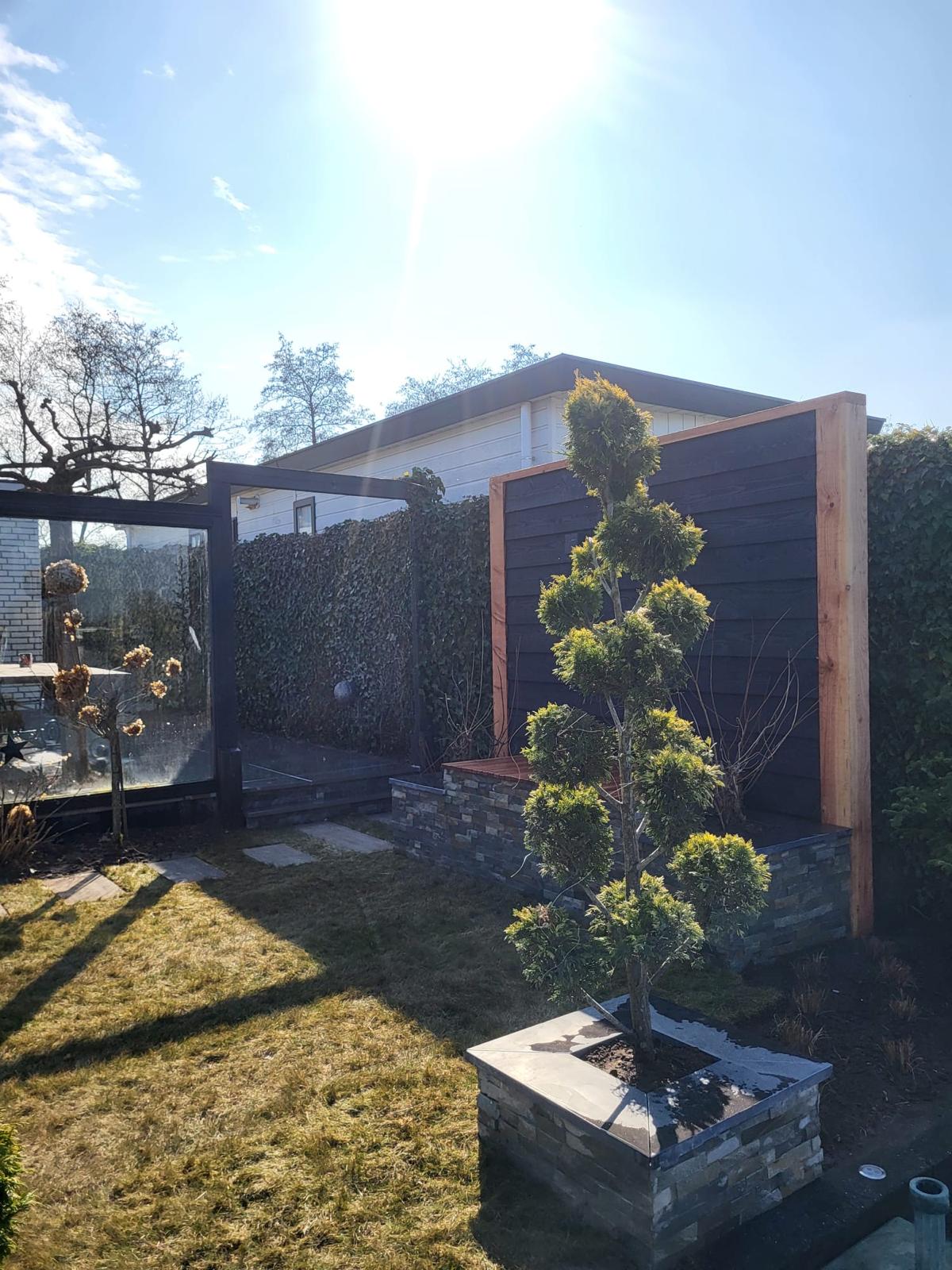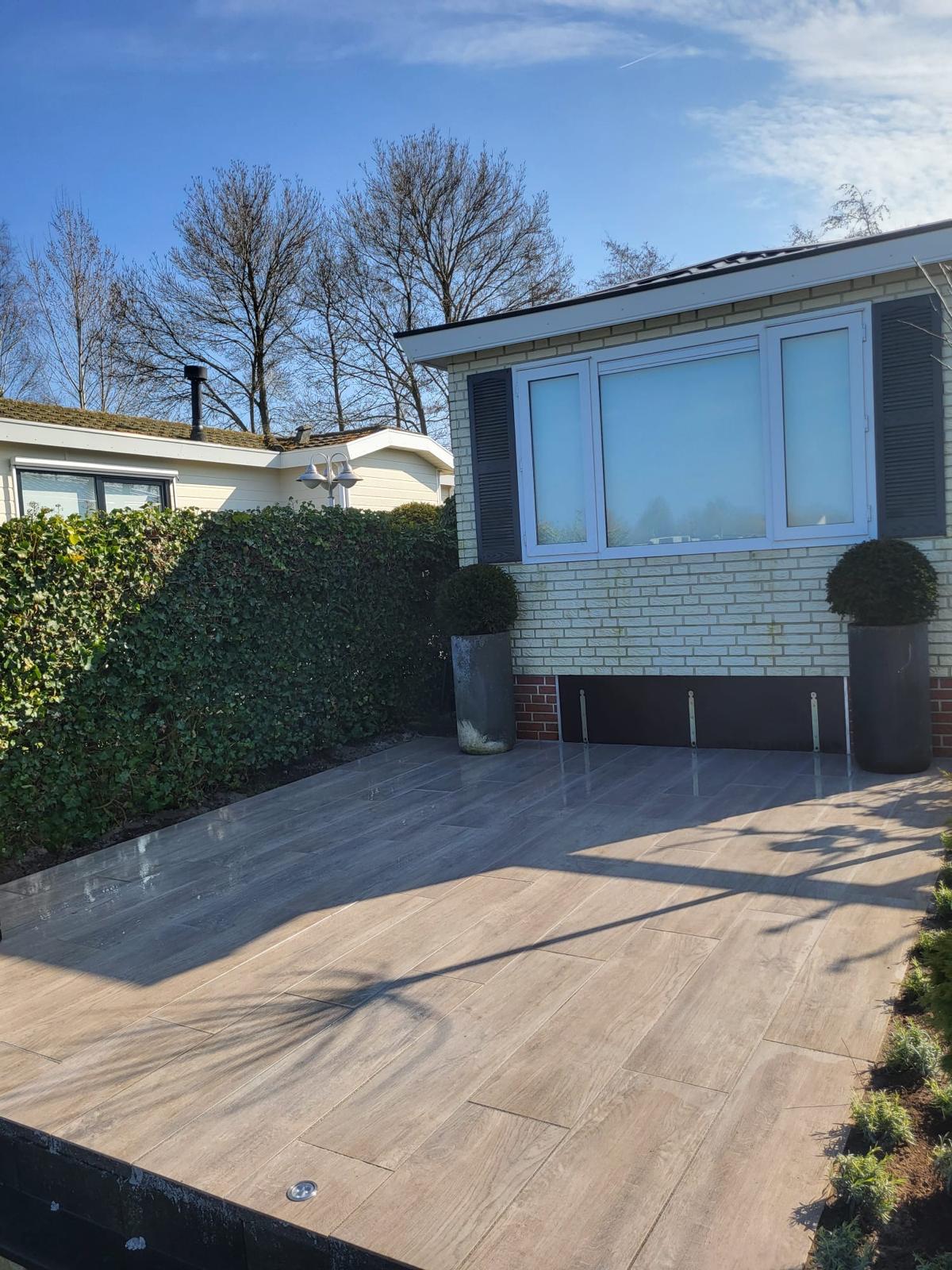 Deze tuin op een vakantiepark in Putten hebben we compleet mogen vernieuwen. In deze tuin zijn veel details verwerkt, de bloembakken zijn bekleed met luxe steenstrips wat een bijzonder element is in deze tuin.