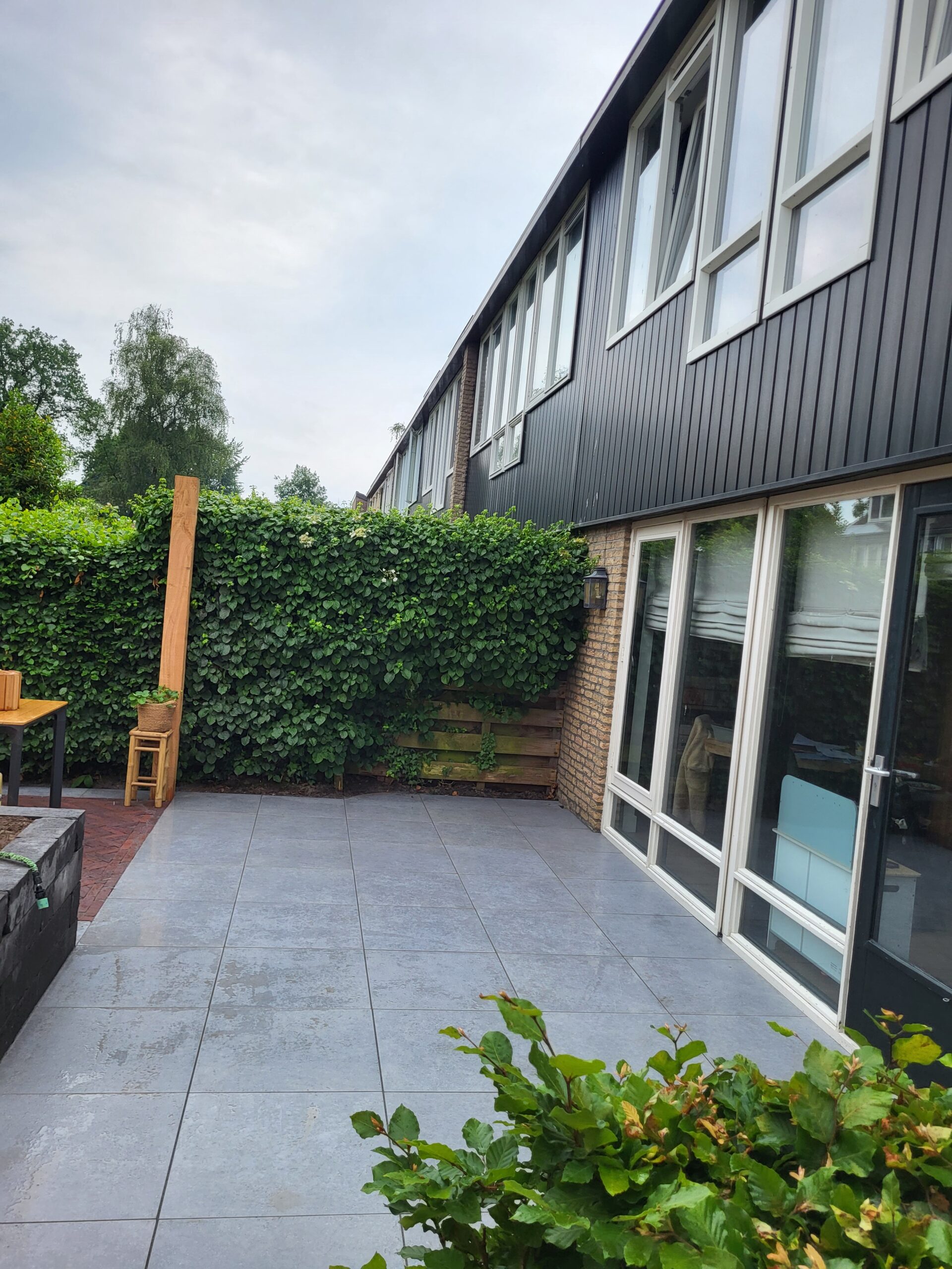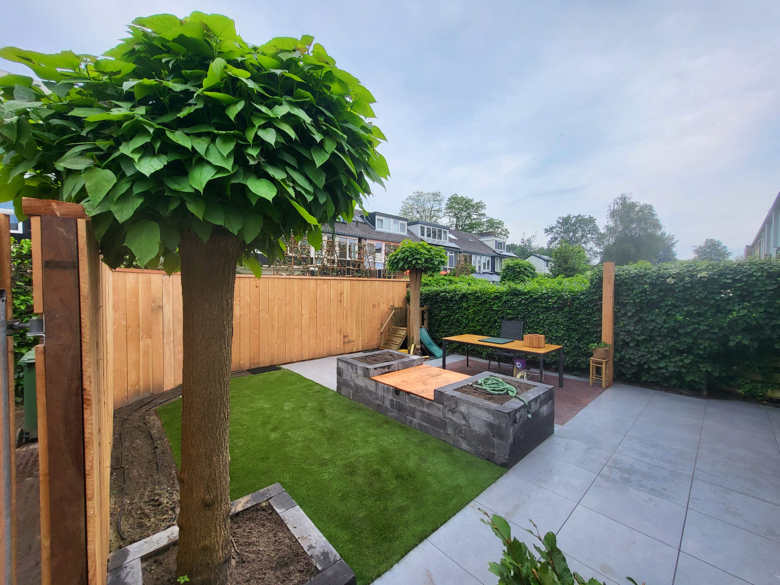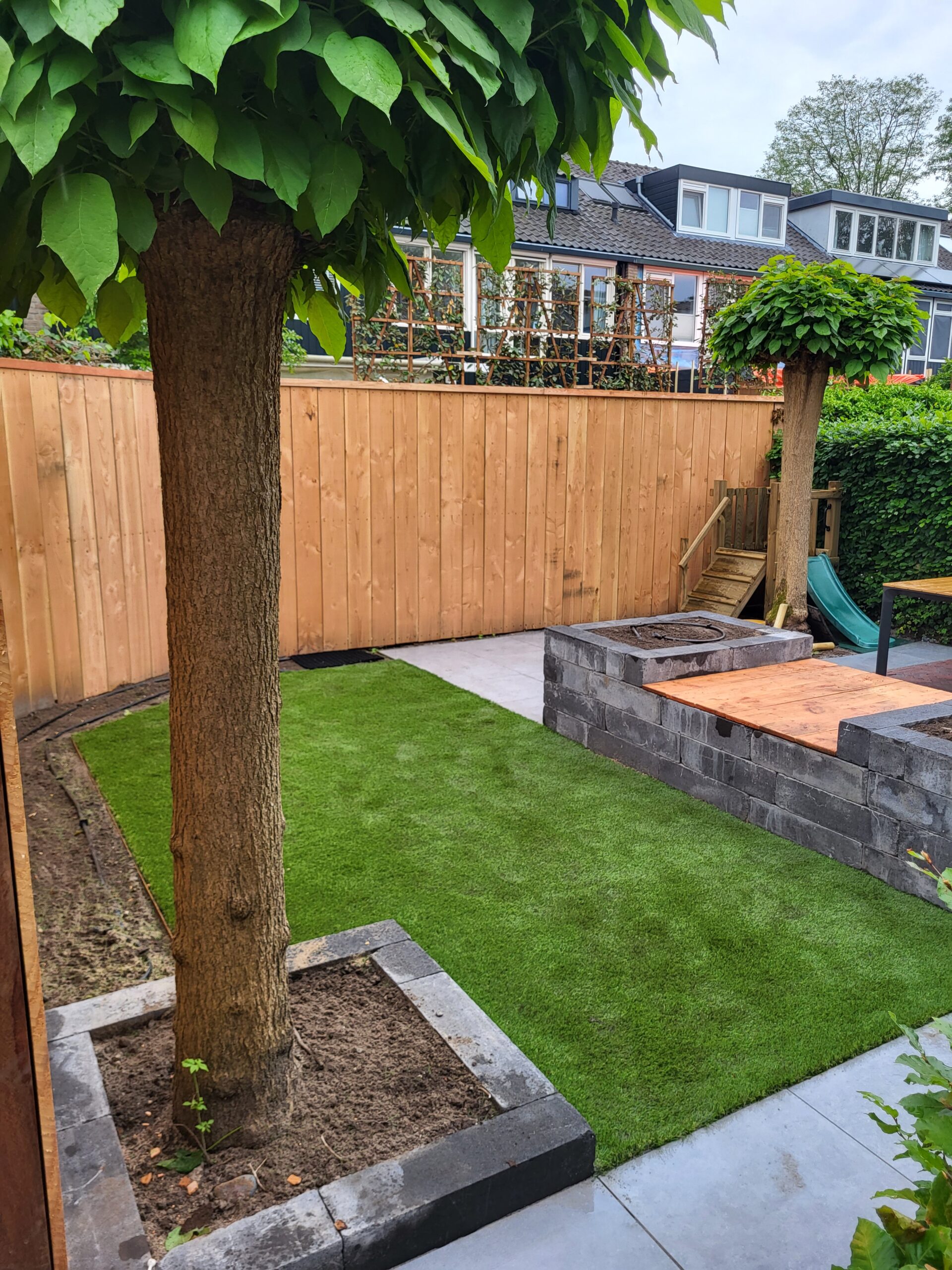 In dit project in Hoevelaken hebben we de tuin van ontwerp tot aanleg gerealiseerd, met een focus op strakke vormen en functionaliteit. Het terras, gelegd met gebakken klinkers in een visgraatpatroon, vormt de stijlvolle basis van de tuin en zorgt voor een unieke uitstraling. Rondom de tuin hebben we een schutting geplaatst met verticale Douglas planken, deze hebben we zelf ontworpen en gemaakt! Het kunstgras zorgt voor een onderhoudsvriendelijke oplossing, ideaal voor de kinderen om veilig te spelen. De ruime opzet biedt veel leefruimte, waardoor de tuin perfect is voor ontspanning en gezinsactiviteiten. Het resultaat is een moderne en kindvriendelijke tuin.