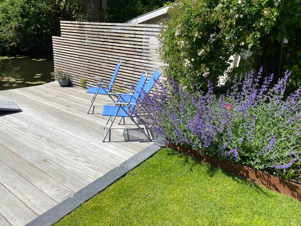 In deze tuin in Lelystad hebben we organische vormen gebruikt om een natuurlijke, vloeiende sfeer te creëren. Diverse beplanting voegt kleur en leven toe, terwijl een verhoogd terras het uitzicht benadrukt en ruimte biedt voor ontspanning. De trap is warm aangekleed, wat de tuin een uitnodigende uitstraling geeft. Bij het water hebben we een vlonder toegevoegd, perfect voor het genieten van het rustige uitzicht. De afscheiding is ontworpen met warme materialen, wat de tuin een gezellige en sfeervolle afwerking geeft.