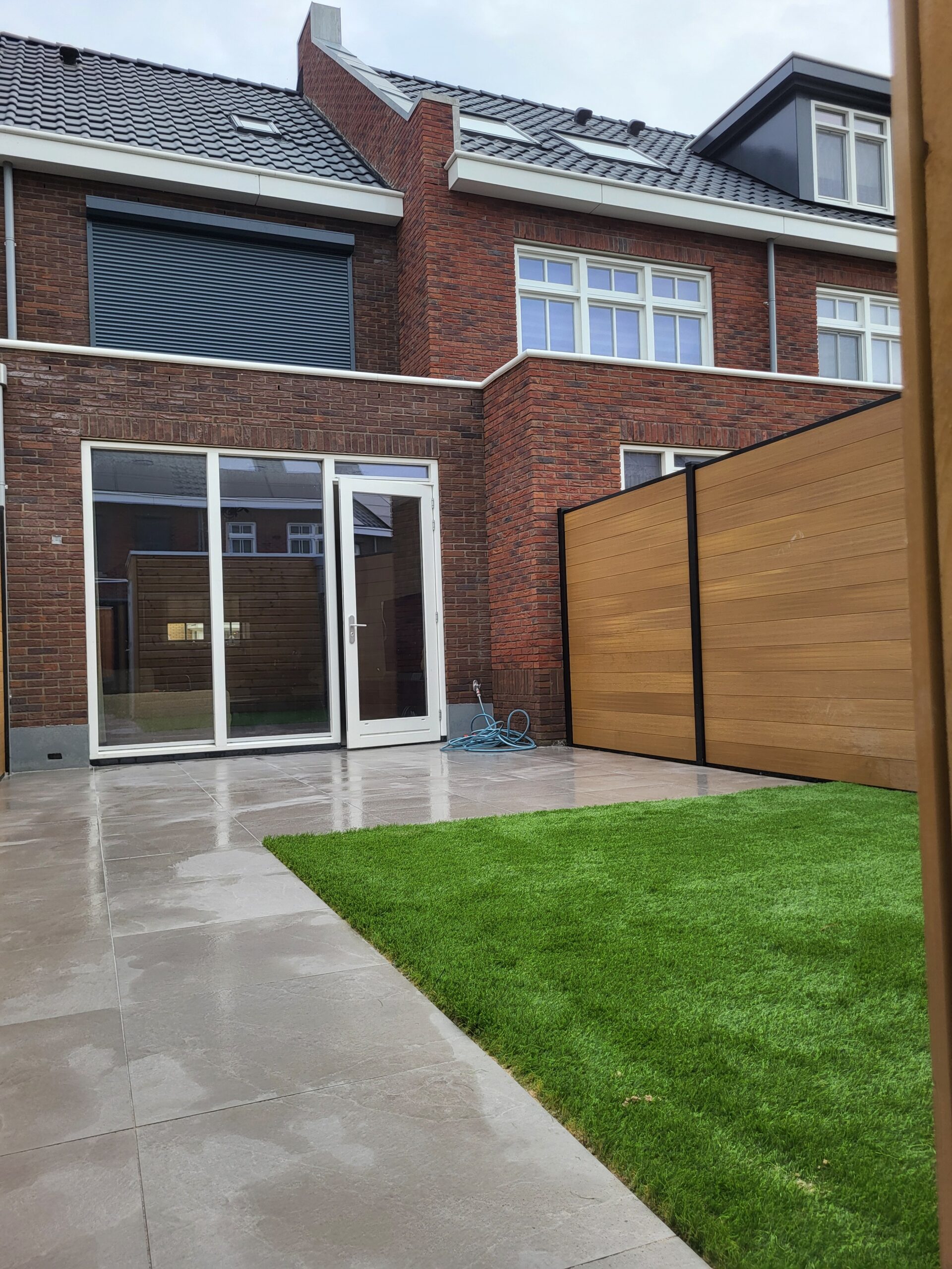 Tuin in Oudenhoorn met keramische tegels, kunstgras en strakke lijnen voor een moderne, onderhoudsvriendelijke en stijlvolle uitstraling.
