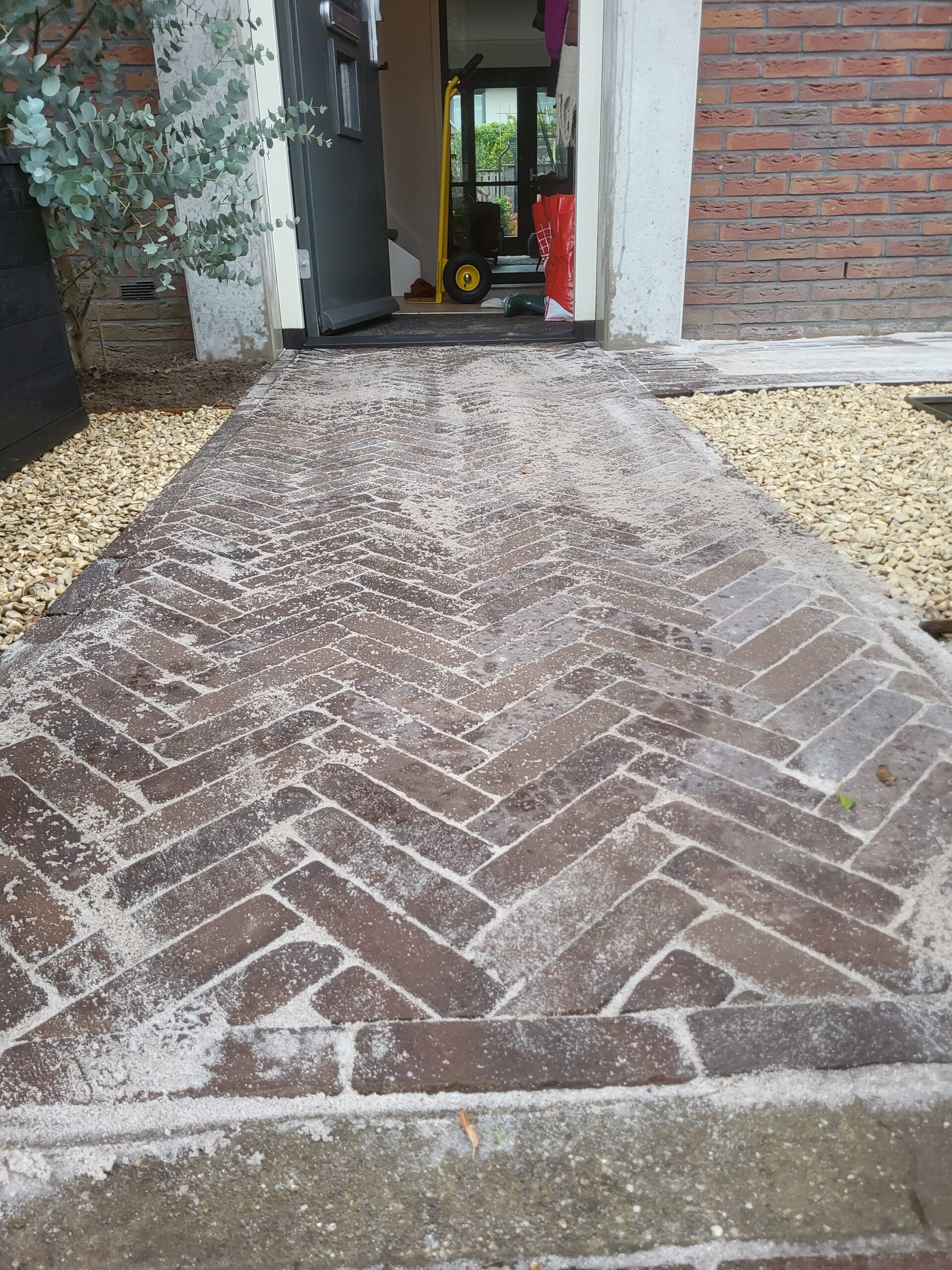 Tuin in Putten met visgraat looppad, Corten stalen bloembakken en grote tegels voor een warme, harmonieuze uitstraling.