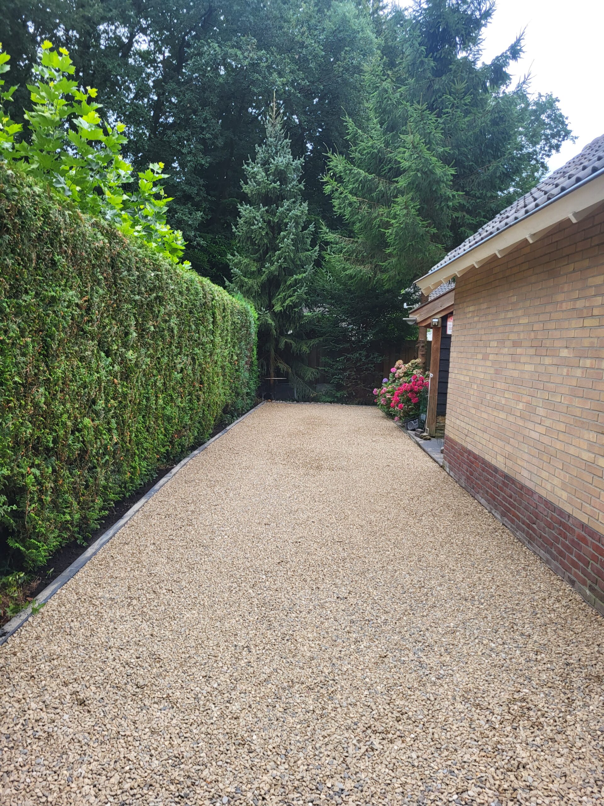 Deze oprit in Putten combineert functionaliteit met stijl. Een stevige puin onderbaan biedt stabiliteit, terwijl grindmatten het grind op zijn plaats houden en de oprit onderhoudsvriendelijk maken. Een klinkerplein onderbreekt het geheel, wat een mooi visueel accent toevoegt en de oprit een gevarieerde uitstraling geeft. Het resultaat is een praktische en strakke oprit.