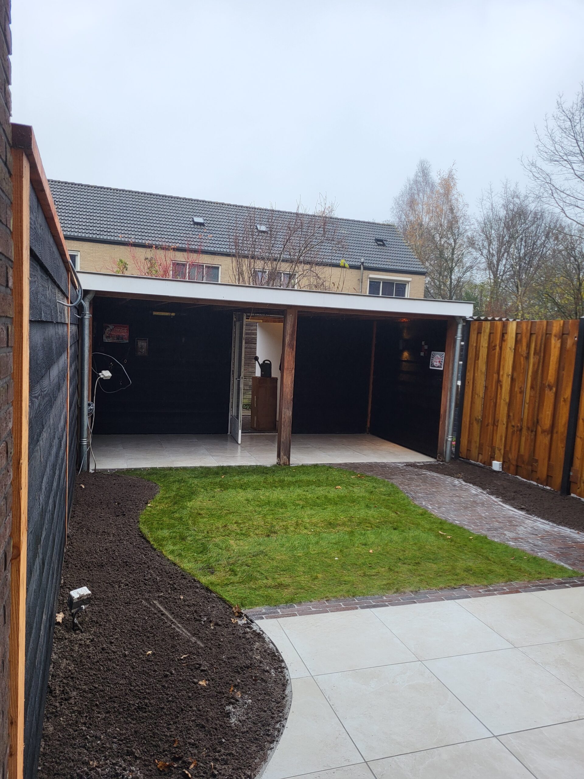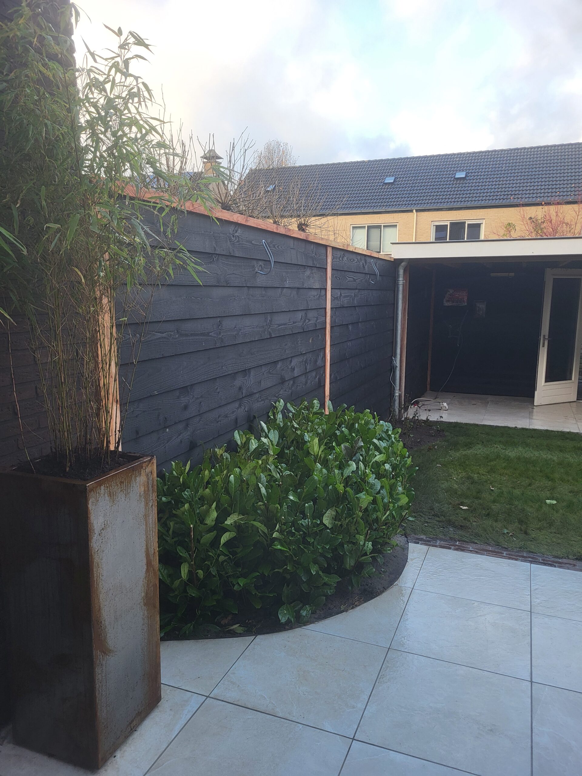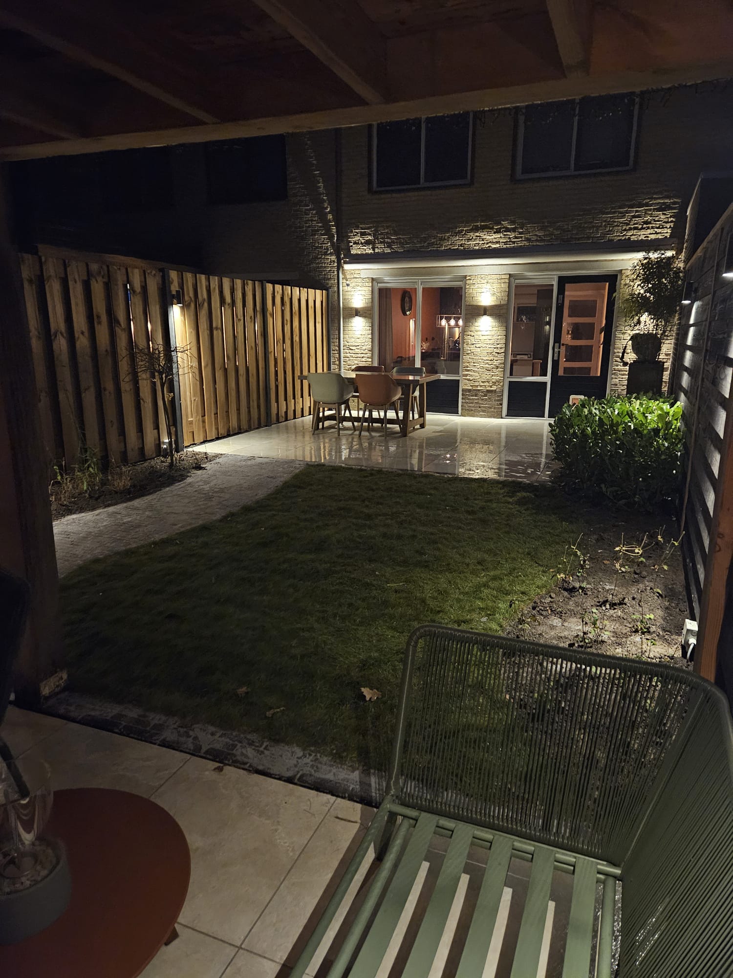 Een uniek element in deze tuin is de op maat gemaakte schutting van duurzaam Douglas hout. Met oog voor detail is het hout zorgvuldig verwerkt, wat resulteert in een robuuste en stijlvolle afscheiding. De warme uitstraling van het Douglas wordt versterkt door sfeervolle wandlampen. Deze schutting is niet alleen functioneel, maar is ook een prachtige toevoeging aan de tuin. Een project waar we trots op zijn!