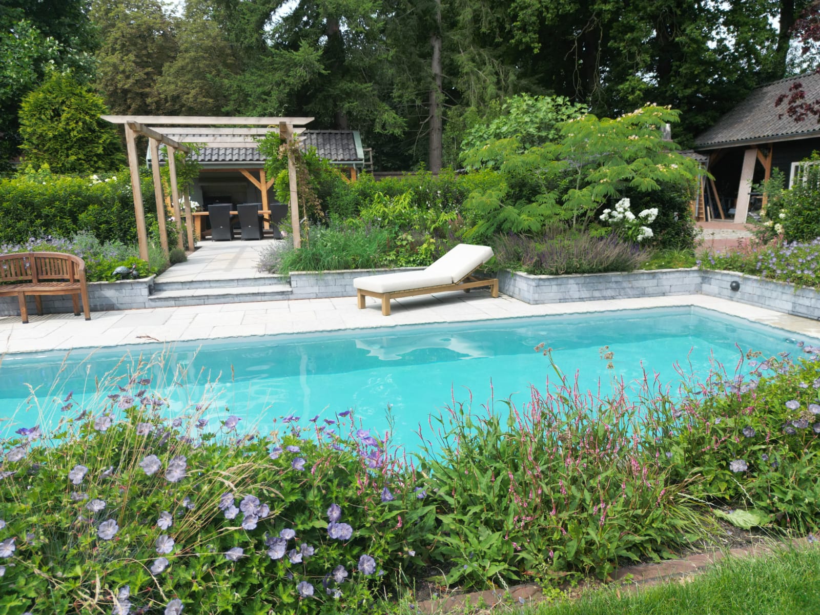Luxe tuin in Zeist met verdiept zwembad, natuurstenen afscheiding, bestrating en een moderne uitstraling.