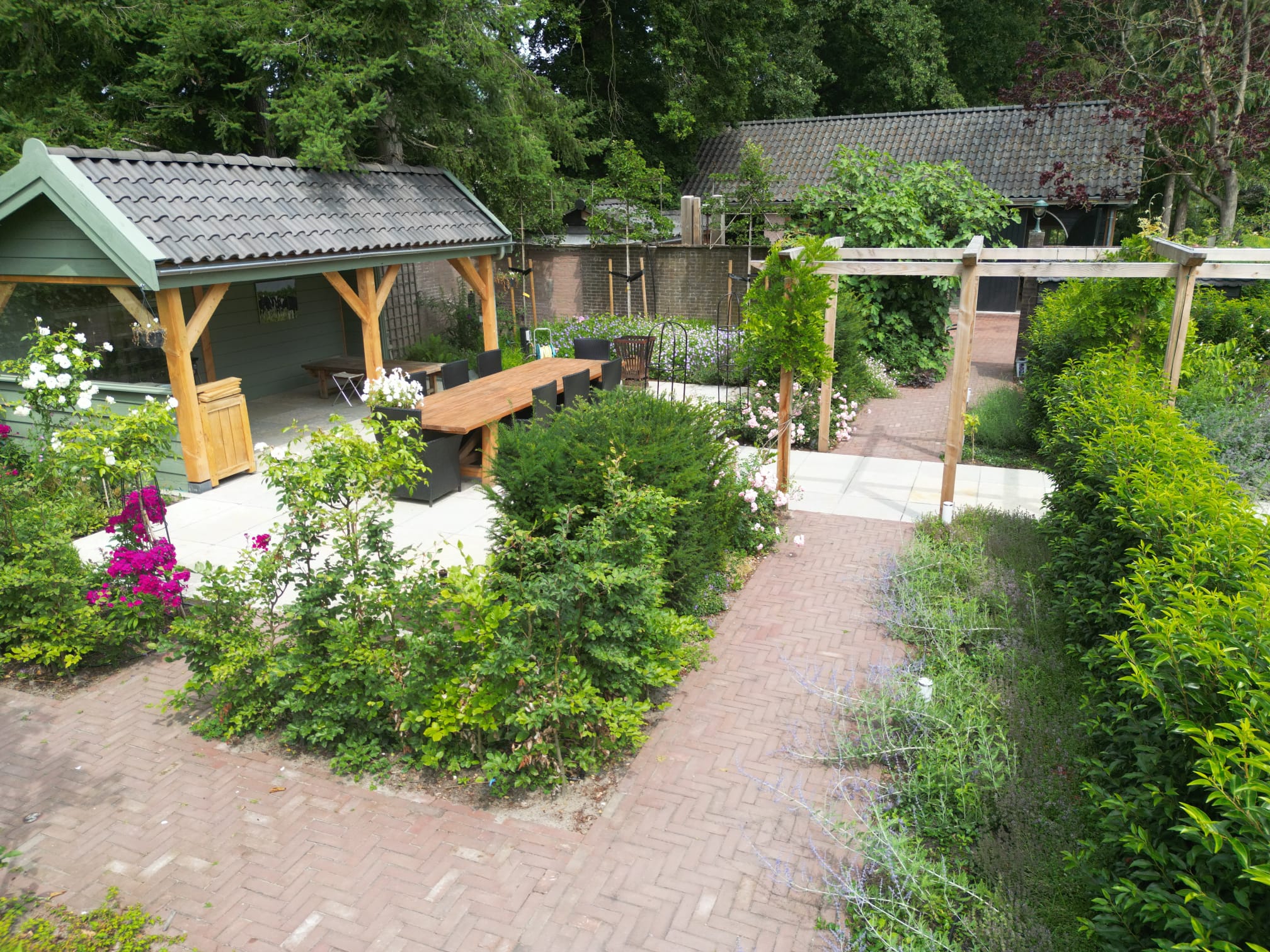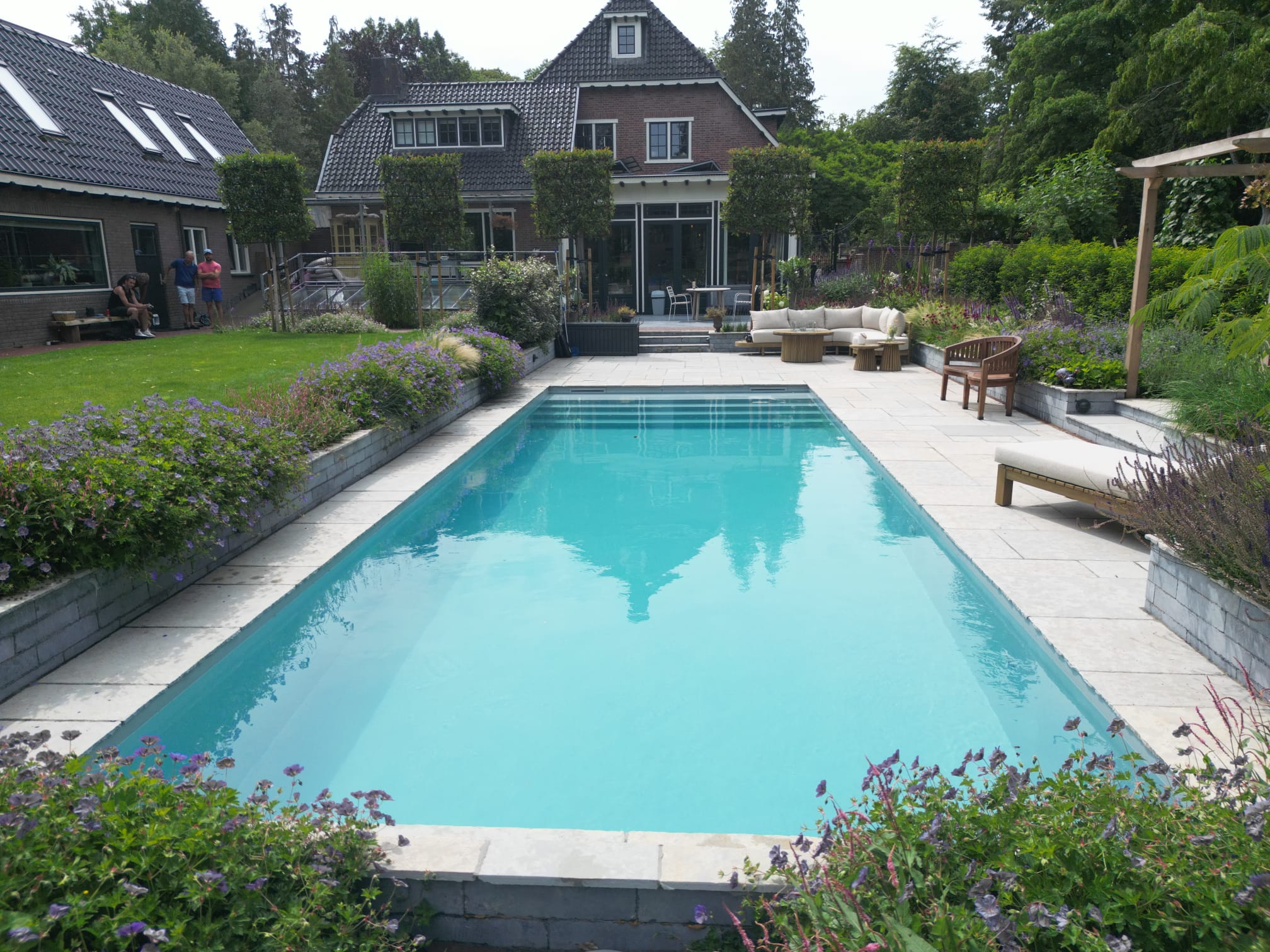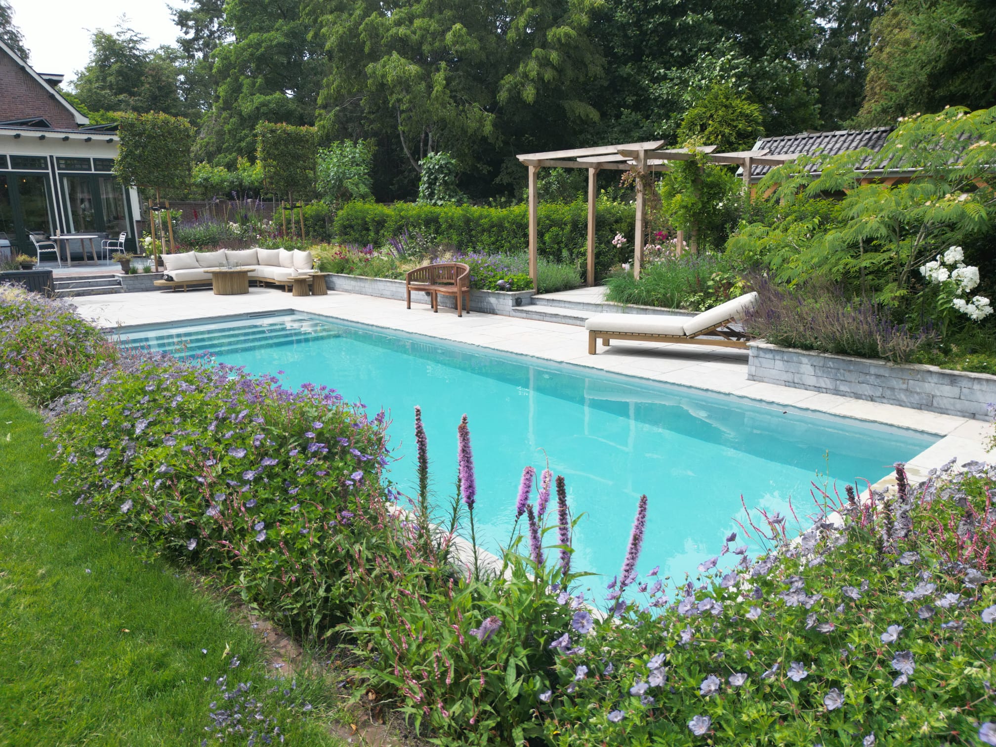 In dit bijzondere project in Zeist hebben we een tuin ontworpen die luxe, functionaliteit en elegantie moeiteloos combineert. Het zwembad, als centraal element van de tuin, is verdiept aangelegd en wordt omringd door een subtiele natuurstenen afscheiding die het hoogteverschil in de tuin op een natuurlijke wijze opvangt. Deze afscheiding zorgt niet alleen voor een vloeiende overgang tussen de verschillende tuinlevels, maar voegt tevens een tijdloze uitstraling toe die de tuin een verfijnde sfeer geeft. De bestrating rondom het zwembad bestaat uit Castlebar stenen, die zorgvuldig zijn gelegd op een stevige Stabimix-basis, waardoor ze zowel esthetisch aantrekkelijk als duurzaam zijn. Deze keuze voor materialen benadrukt de luxe en stabiliteit van het ontwerp, waardoor het geheel jarenlang zijn charme behoudt.